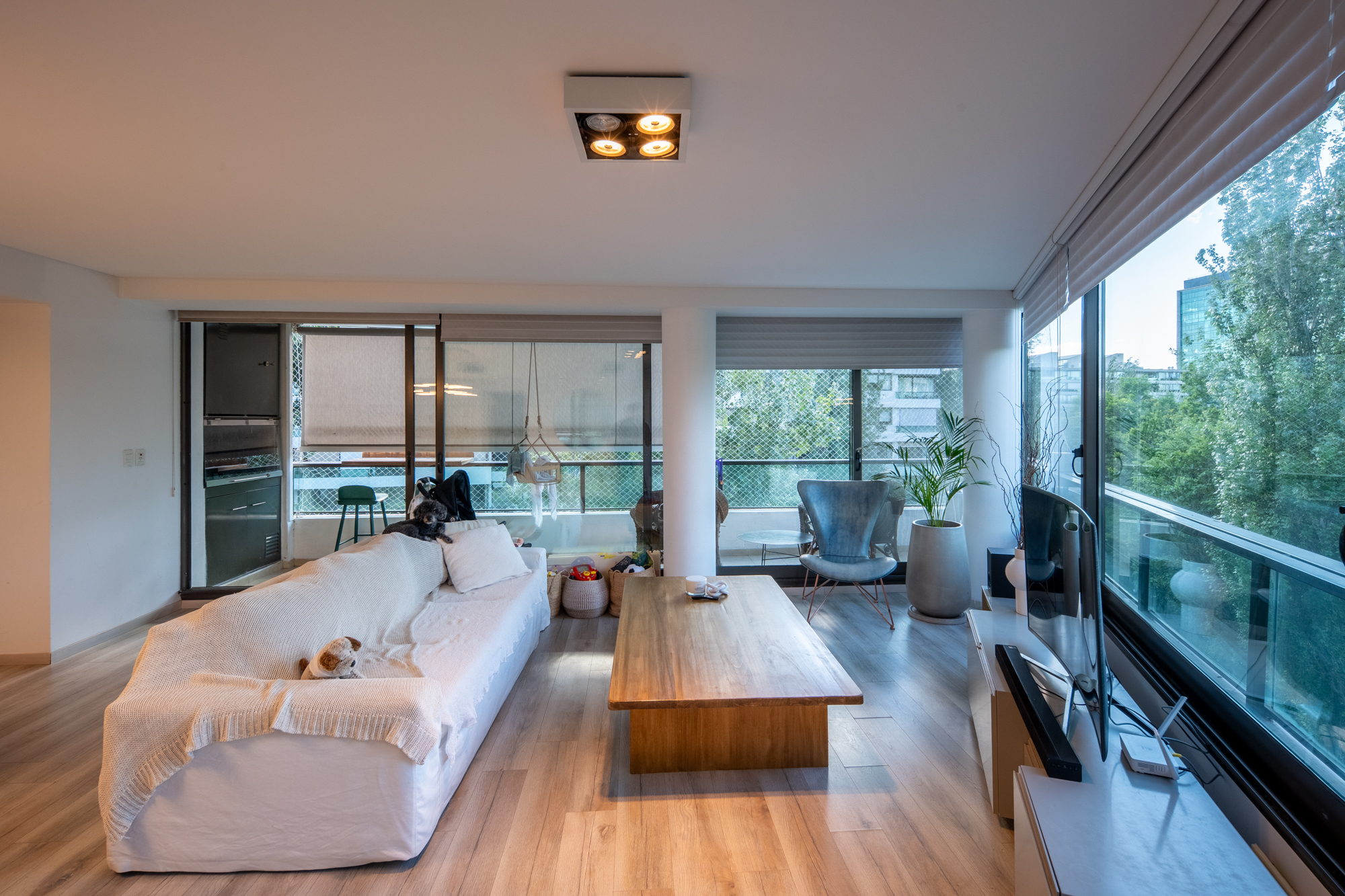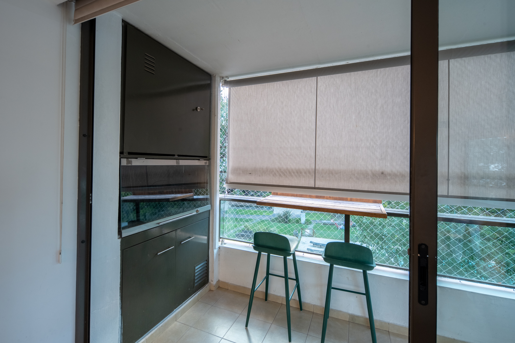 Balcón con parrillero propio con vistas verdes hacia el centro del complejo.