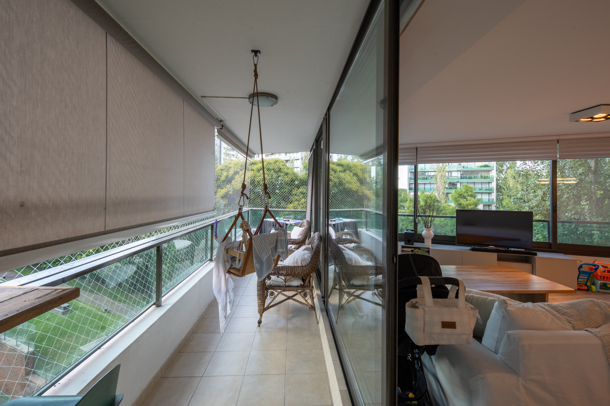 Balcón con parrillero propio con vistas verdes hacia el centro del complejo.